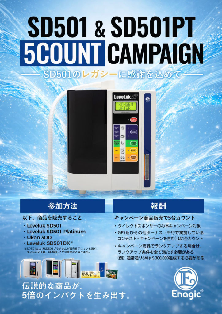 エナジックの伝統的な商品であるSD501シリーズを称える特別キャンペーンです。キャンペーン期間中に対象商品のSD501、SD501プラチナム、ウコンΣ3DDのいずれかを直接販売すると、販売実績が5台(4台のボーナスポイント(BP)を付与)としてカウントされます。