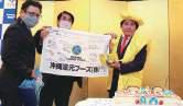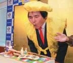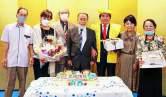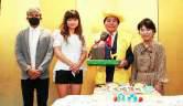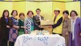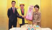 その後、壇上に大城会長&八重子常務の似顔絵入りケーキが登場。大城会長がロウソクの灯を吹き消したあと、参加者から続々とプレゼントが贈られました。