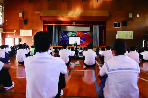 11月11日、沖縄県名護市にある、小中一貫校の市立緑風学園で、大城博成会長が講話をおこないました。同学園に寄付をしたことに伴い依頼されて実現し、1年生から9年生(中3に該当)までの生徒たち全員が聴き入りました。