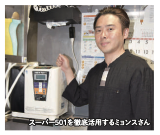 スーパー501を導入し、生成する強還元水と強酸性電解水を組み合わせて、テーブル、ドアノブ、床、ガスコンロ等々の清掃をおこなうようになった。おかげで「コロナ禍」も全く問題なく乗り切ることができたとういう。