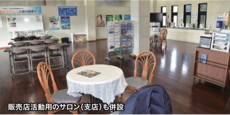 このゴルフクラブで特徴的なのは、エナジックの“本業”であるレベラックシリーズ等の普及の拠点としてサロン(支店)を併設していることです。オフィススペースのほか、広々としたセミナールームや製品ショールームなどを備え、販売店活動にフル活用されています。