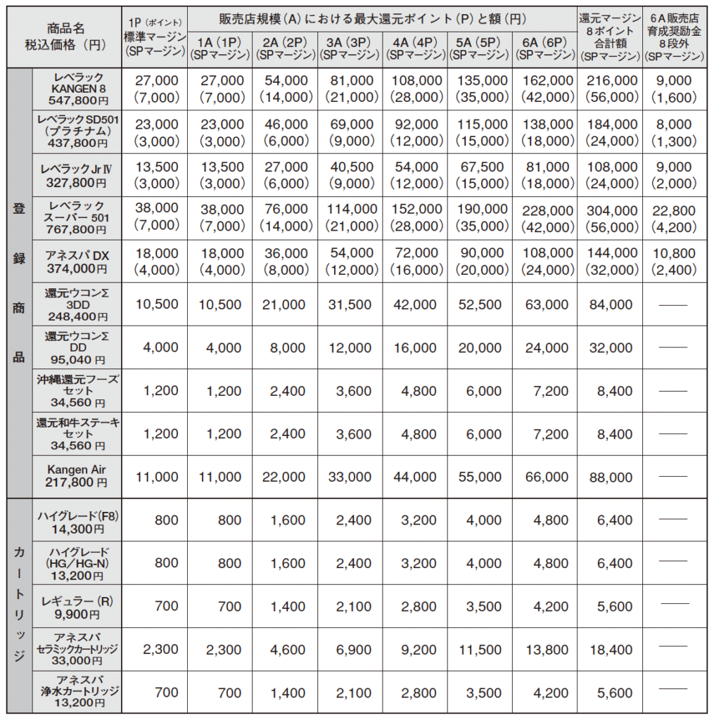 ●沖縄還元フーズセットもしくは還元和牛ステーキセットで初回登録した販売店のマージンは、標準および SP ともに還元ポイント0.5 換算で支払われます。Kangen Air で初回登録した販売店のマージンは、標準および SPともに還元ポイント(6/11) 換算で支払われます。なお、器械または還元ウコンを自己購入した場合は、還元ポイントは通常通り支払われます。