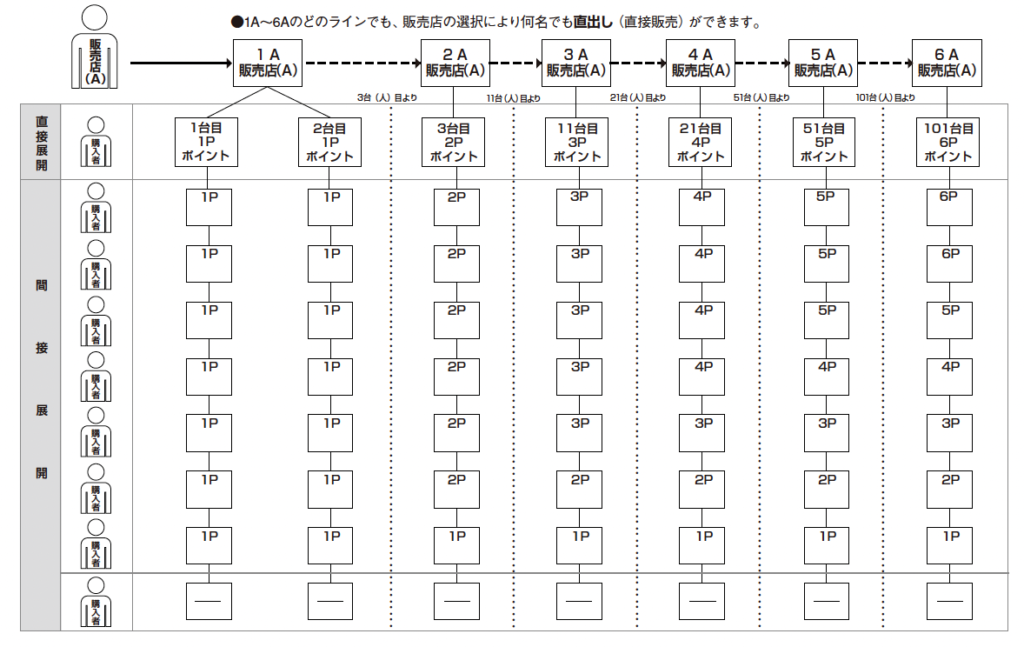 新規会員である販売店(A)がエナジックビジネスを開始されて、1A~6A販売店に昇格していく過程で、各段階の購入者へ商品が流通した時、販売店(A)にいくらの収入ポイント(P)マージンが発生するかを表しています。